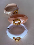 Ajoutez une touche de sophistication à votre poignet avec ce bracelet jonc d'un blanc immaculé. Ce bijou se distingue par son design moderne et épuré, et s’ouvre et se ferme facilement grâce à son fermoir doré en forme de goutte. Fabriqué à partir de matériaux lisses et résistants, il offre un confort optimal au quotidien et s'adapte à toutes vos tenues.