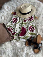 (PRECOMMANDE ARRIVE JEUDI) Découvrez notre élégante veste sans manches, confectionnée en 100 % coton pour un confort optimal. Cette pièce unique se distingue par sa broderie délicate, mettant en valeur des motifs floraux et géométriques soigneusement réalisés. Parfaite pour un look à la fois décontracté et chic, elle s'adapte à toutes les morphologies avec une large gamme de tailles, allant du 36 au 42. Que ce soit pour une sortie au printemps ou une soirée d'été, cette veste apportera une touche d'élégance à toutes vos tenues.