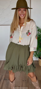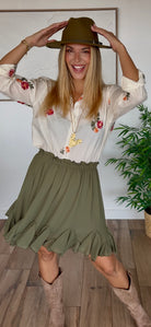 Découvrez la jupe Bella dans sa magnifique couleur kaki, une pièce incontournable qui allie style naturel et sophistication. Cette superbe jupe vous séduira par sa coupe flatteuse et ses détails romantiques qui subliment votre silhouette.