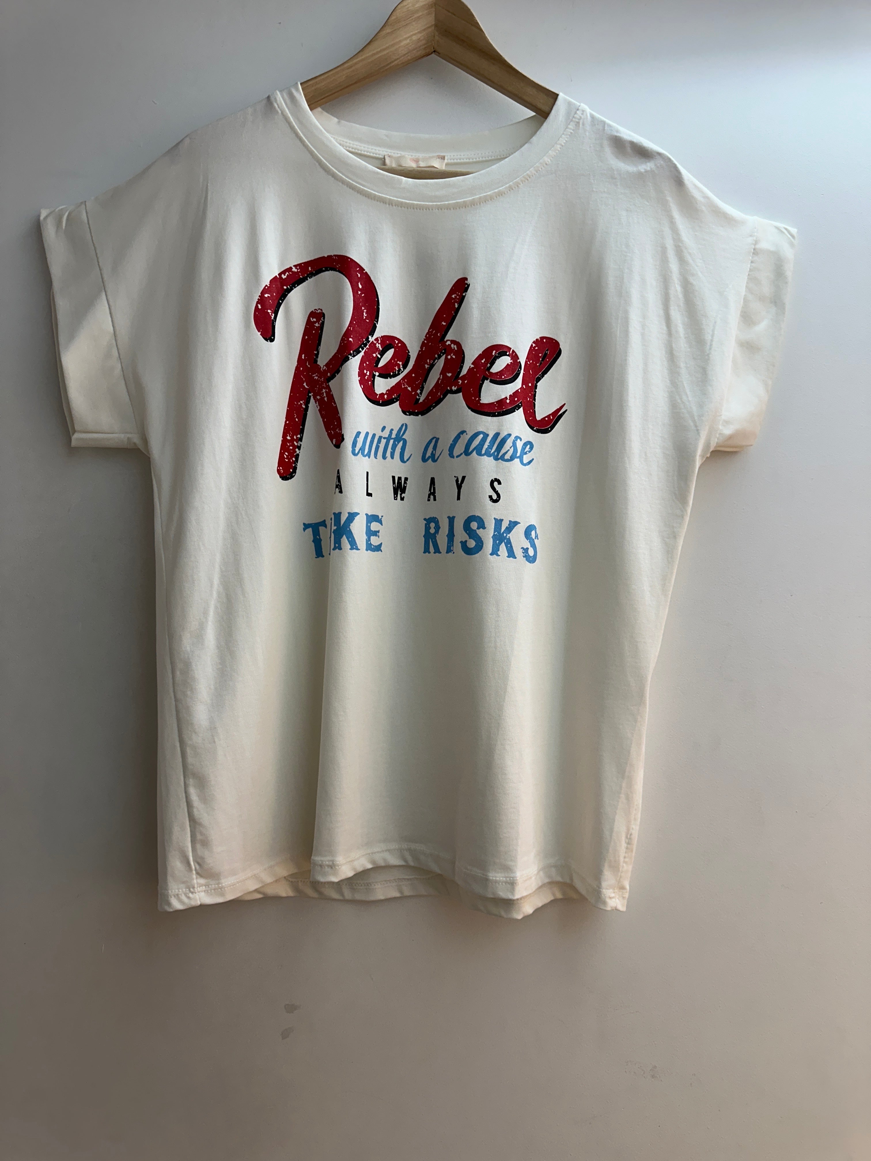 Adoptez un look casual et tendance avec ce T-shirt imprimé "Rebel"Conception. Son design américain avec son imprimé rouge sur fond blanc en fait une pièce forte et stylée. Confectionné en 95% coton et 5% élasthanne , il est à la fois doux, confortable et légèrement extensible pour s'adapter parfaitement à votre silhouette.
