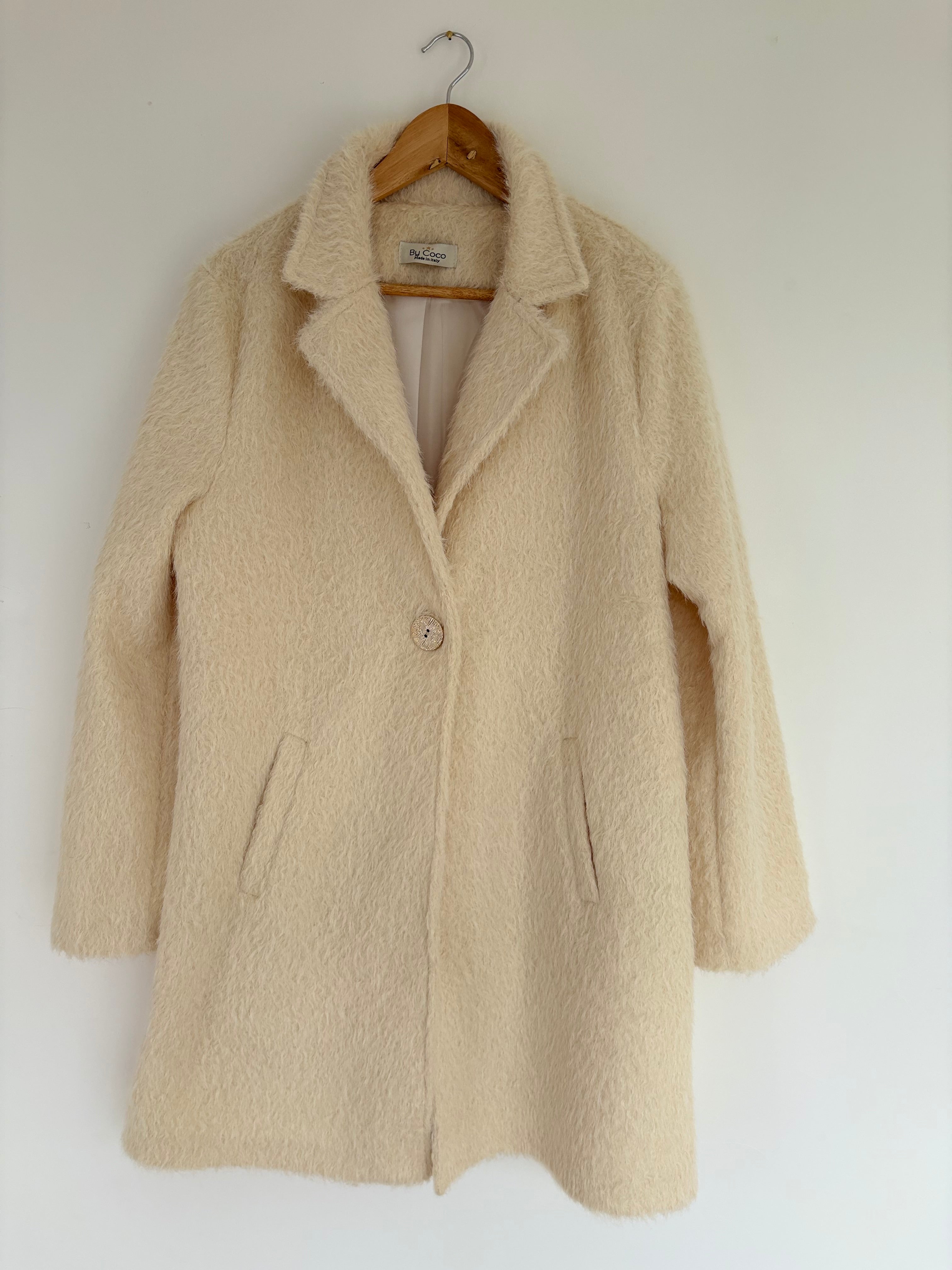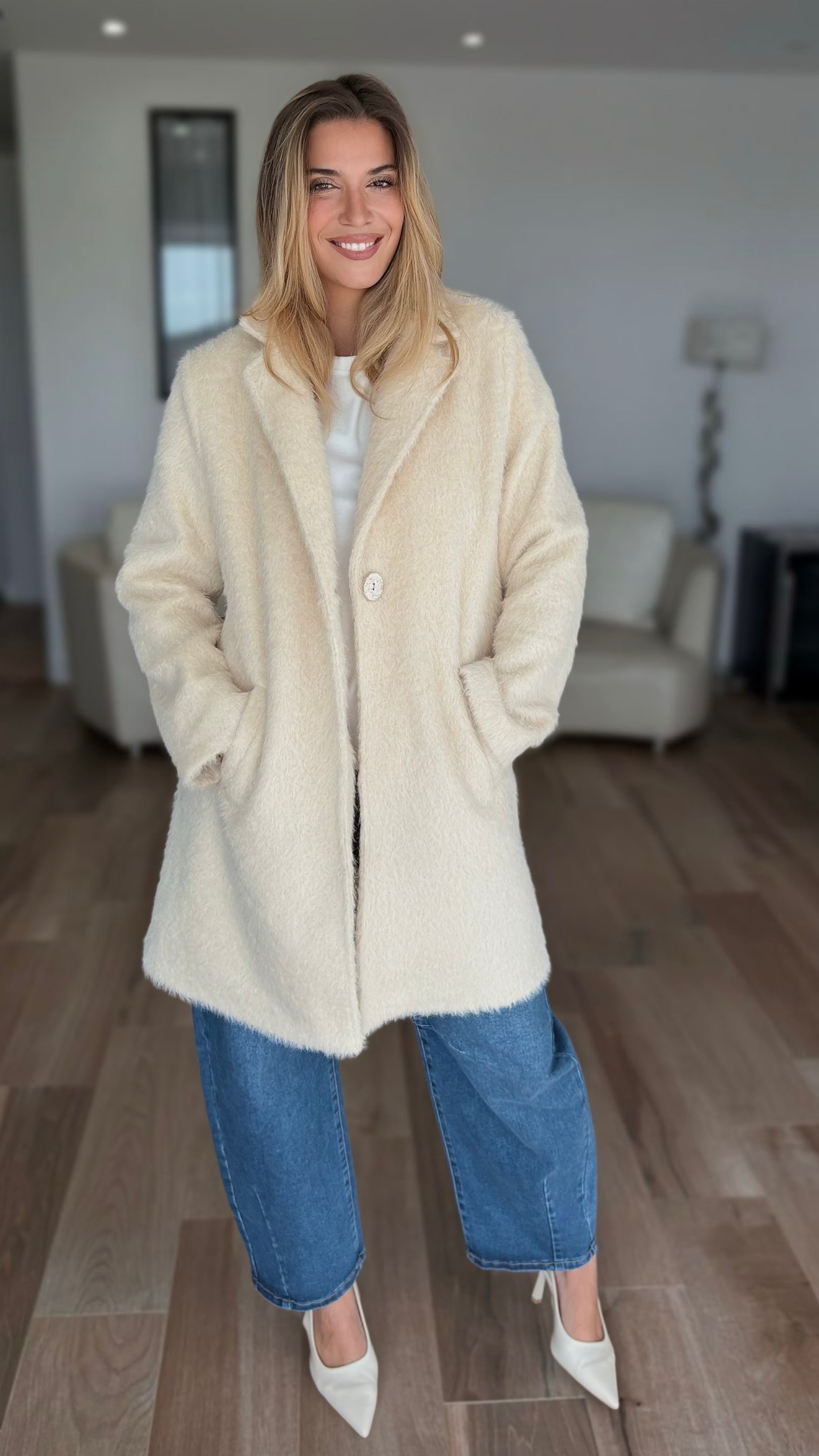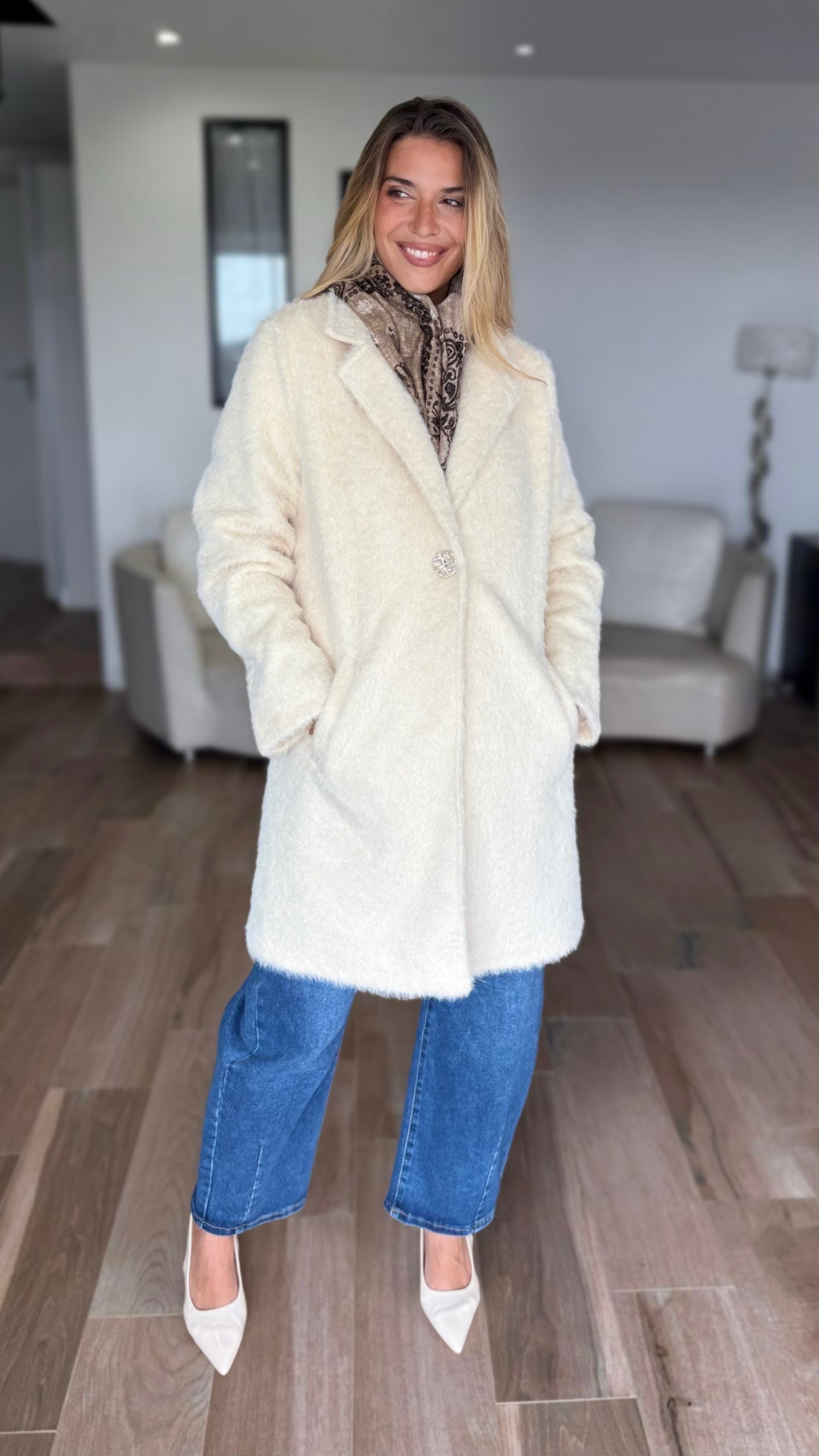 Sa couleur beige intemporelle et sa matière moumoute ultra douce créent un look cosy et élégant. Pratique avec ses poches, cette veste se porte aussi bien en ville qu'en week-end pour un style décontracté chic.