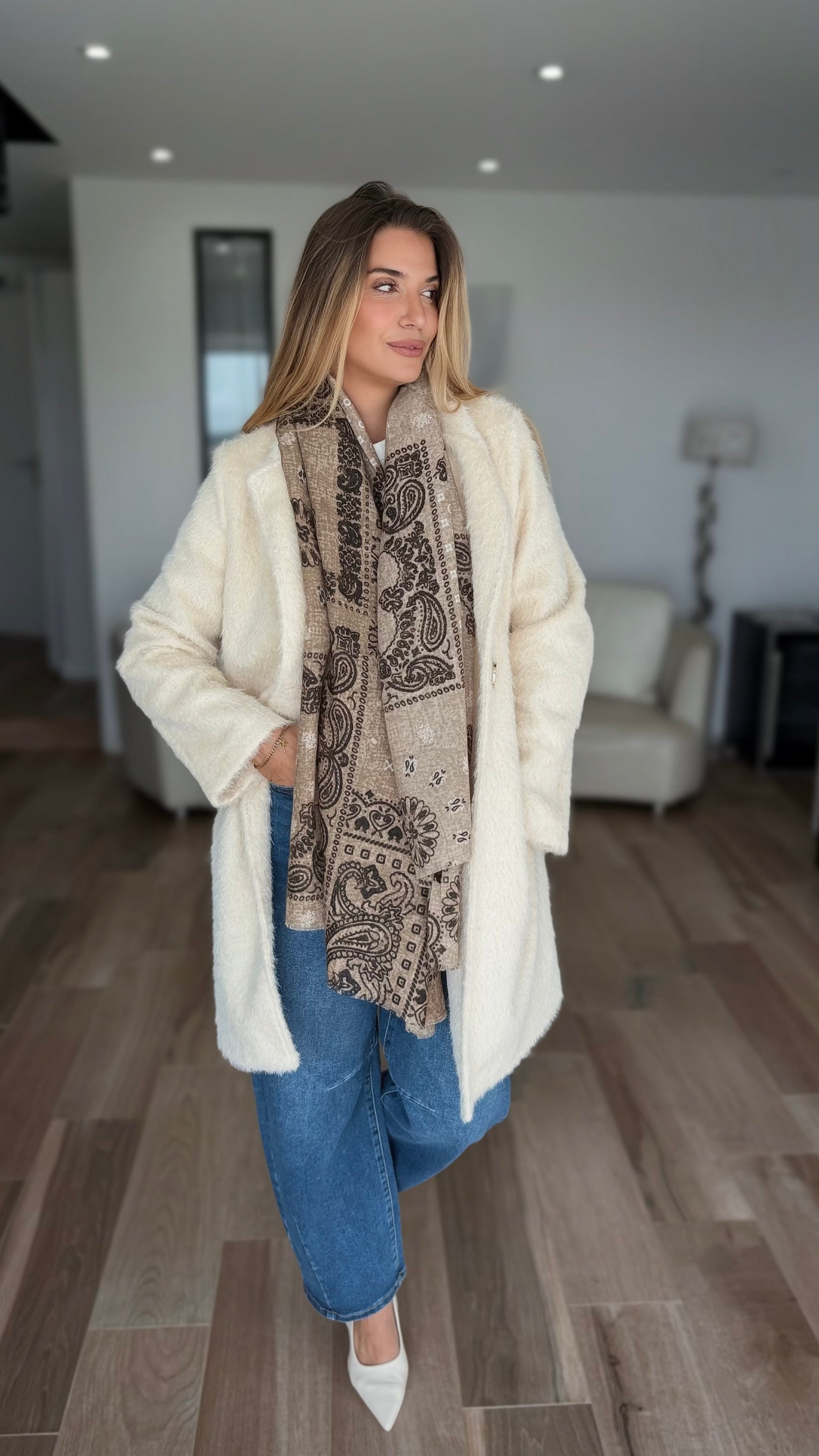 Sa couleur beige intemporelle et sa matière moumoute ultra douce créent un look cosy et élégant. Pratique avec ses poches, cette veste se porte aussi bien en ville qu'en week-end pour un style décontracté chic.