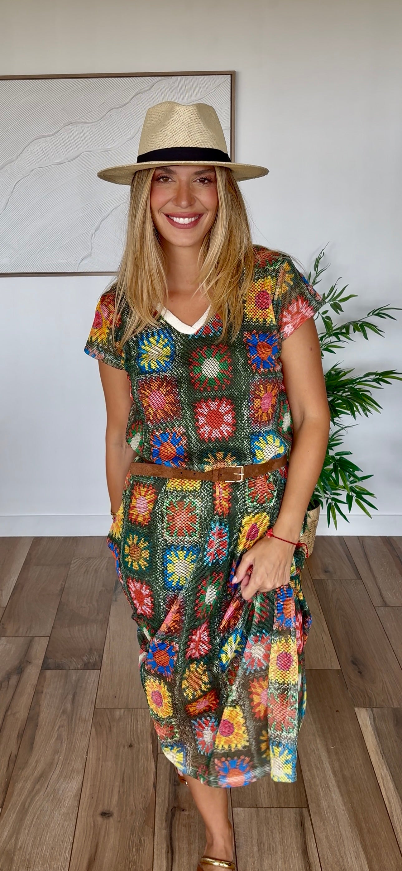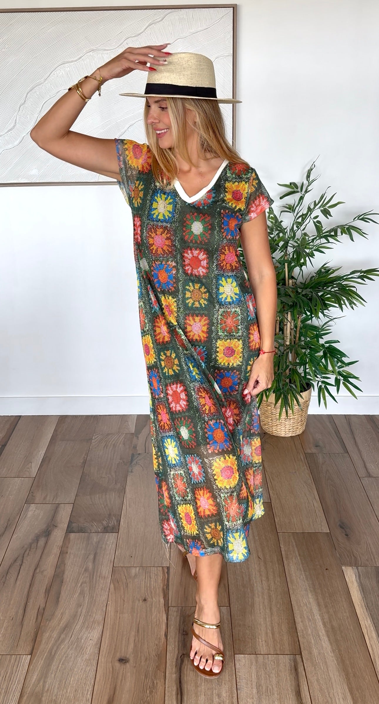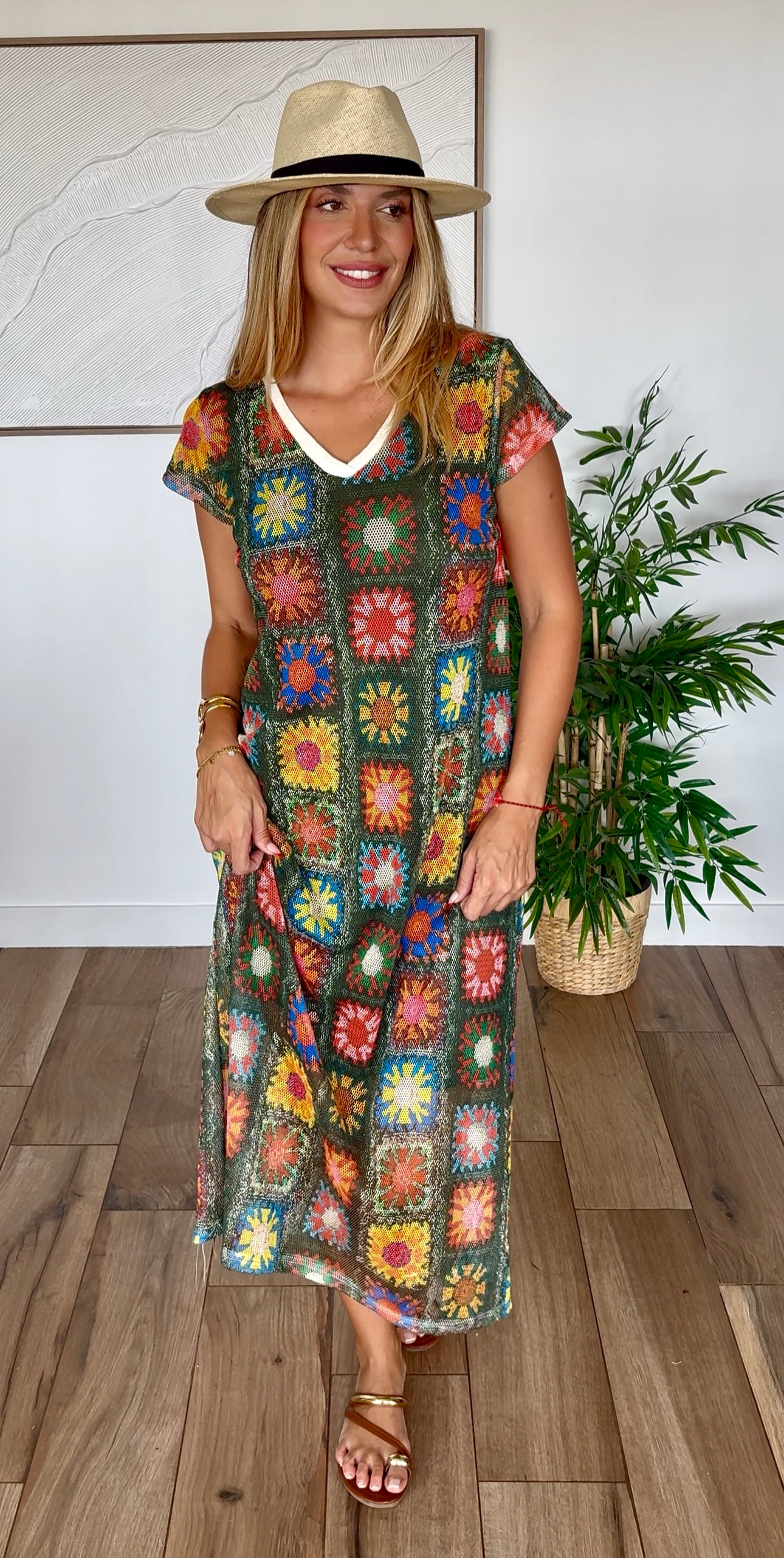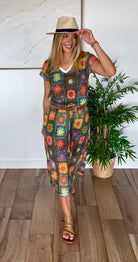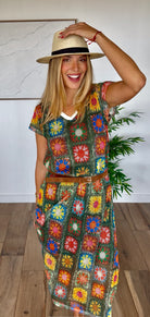 Cette magnifique robe longue Made in Italy vous transporte dans l'esprit bohème des seventies avec ses motifs crochet multicolores éclatants sur fond kaki. Chaque carré de crochet raconte une histoire de couleurs : tons terreux, bleu azur, jaune soleil, violet royal et bien d'autres nuances qui s'harmonisent parfaitement avec la base kaki naturelle.