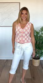 Craquez pour le charme rétro et bohème de ce gilet sans manches en crochet fait de délicates fleurs blanches et jaunes au style Granny chic. Entièrement crocheté dans des tons rose, ce modèle apporte une touche vintage ultra tendance à vos tenues estivales.