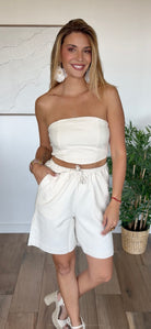 Ajoutez une touche élégante à votre look avec notre Crop-top écru chic. Conçu pour apporter du style tout en étant pratique, cet accessoire est parfait pour compléter vos tenues estivales ou pour une soirée décontractée. ( A associer avec le bermuda et la veste blazer) .