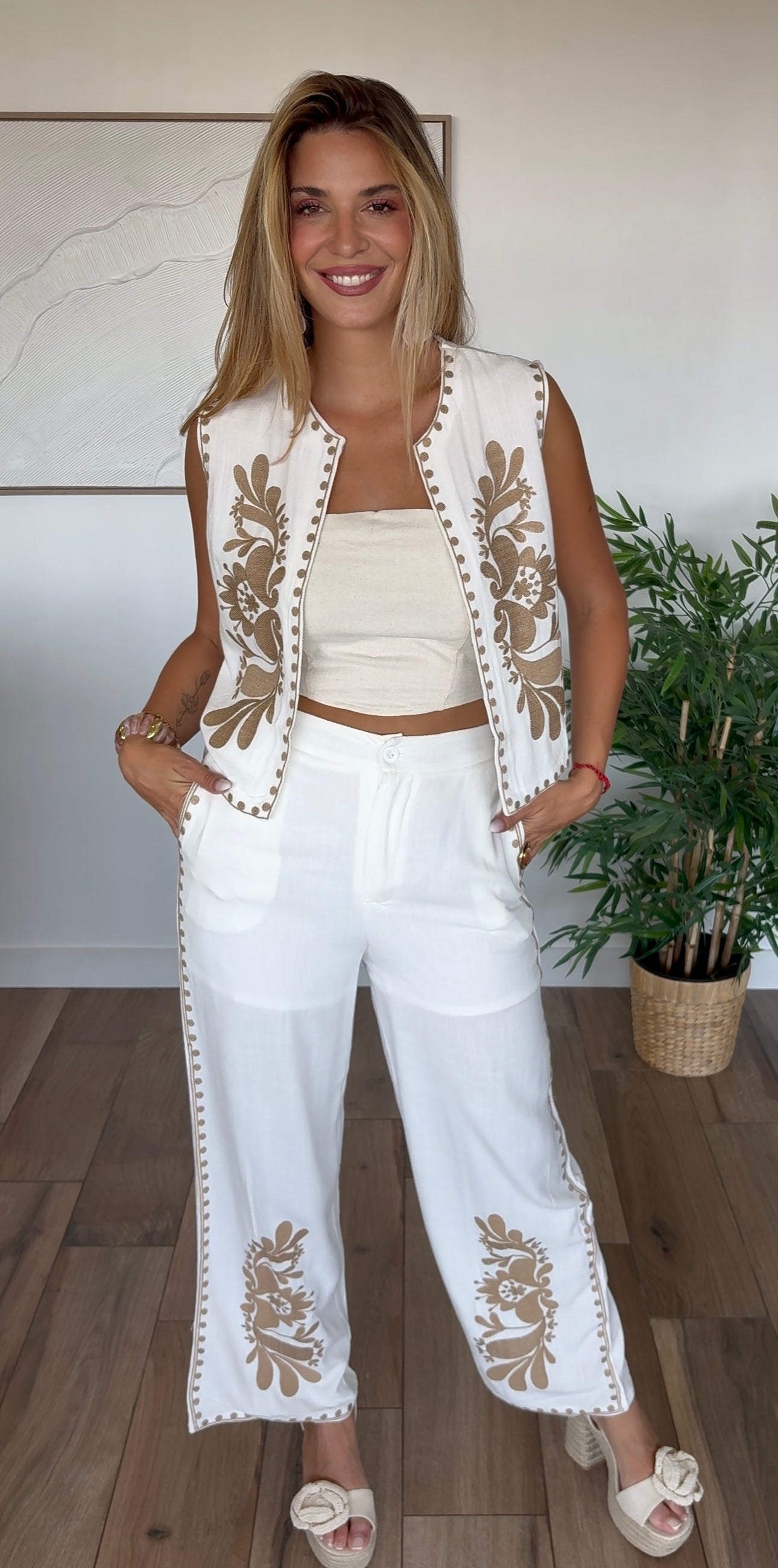 Ajoutez une touche distinctive à votre garde-robe avec notre pantalon brodé écru. Conçu avec un souci du détail, ce pantalon allie confort et style, parfait pour toutes les occasions.