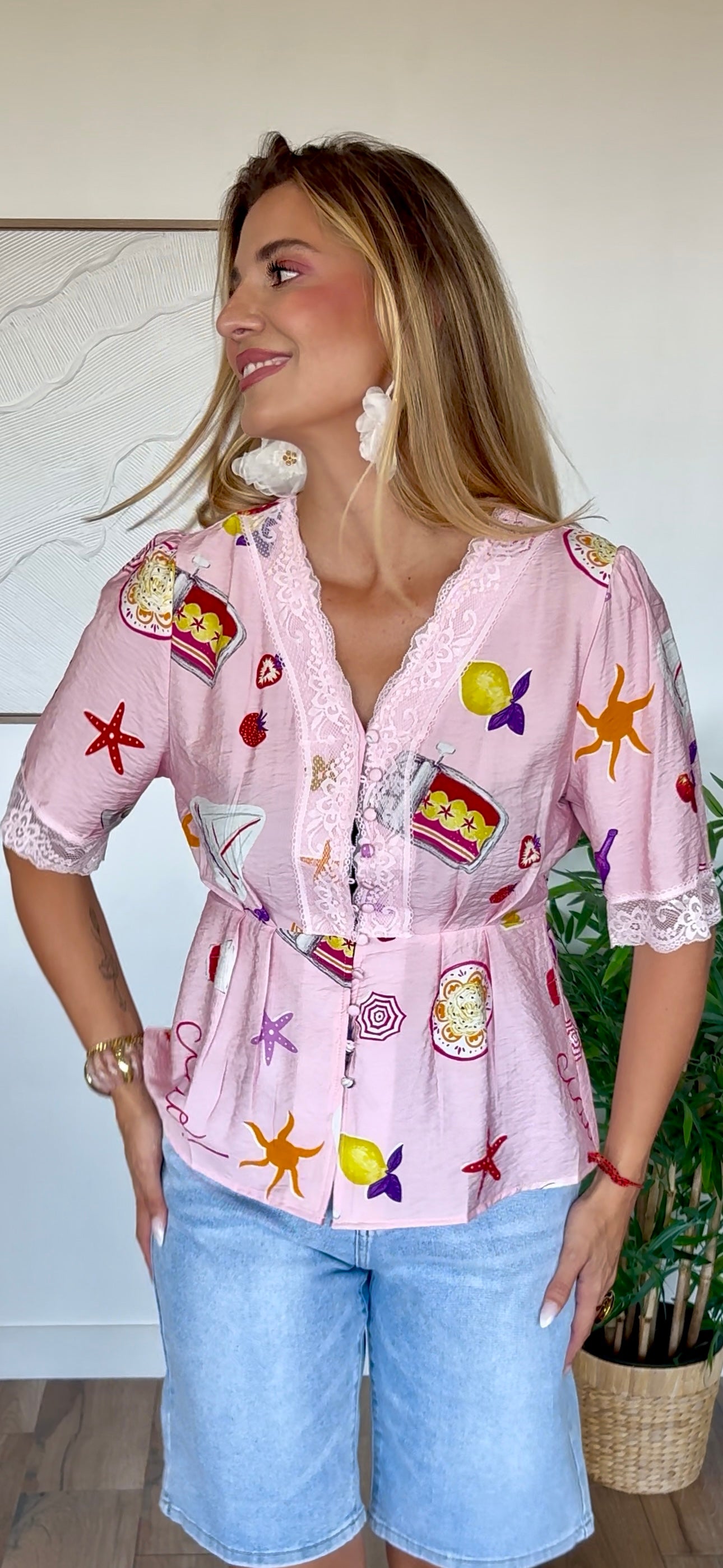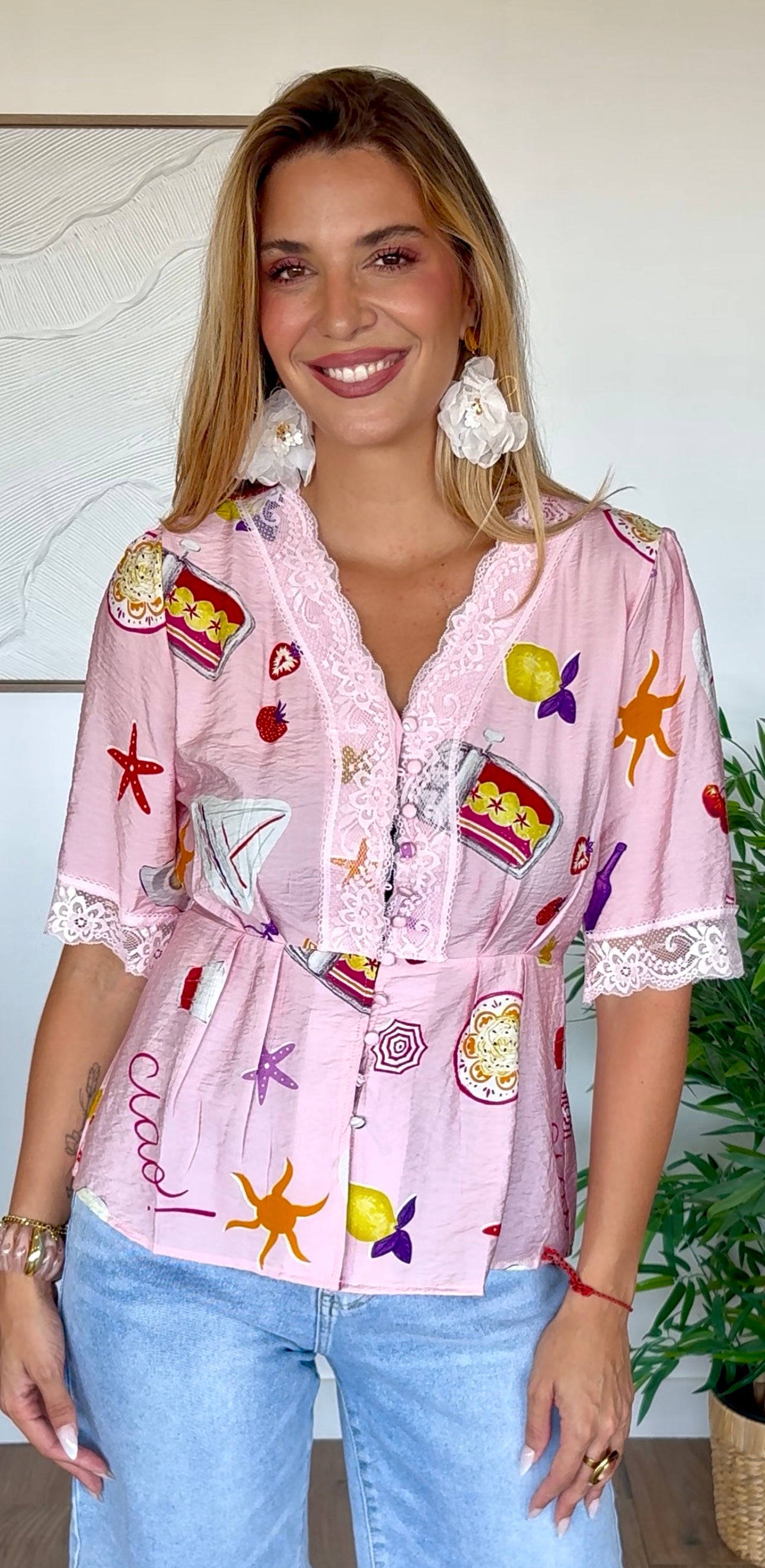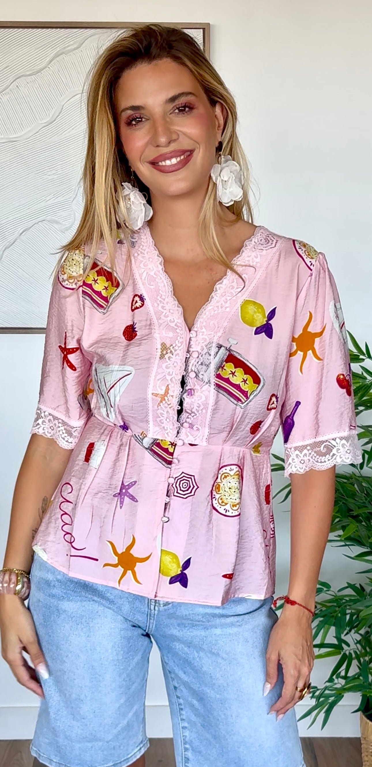 Ajoutez une touche de fraîcheur à votre garde-robe avec notre blouse colorée imprimée rose. Conçu pour celles qui aiment se démarquer, elle est parfaite pour apporter une note ludique à vos tenues estivales.