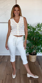 Craquez pour le charme rétro et bohème de ce gilet sans manches en crochet, fait de délicates fleurs blanches et jaunes au style Granny chic. Dans des tons jaune beurre, ce modèle apporte une touche vintage ultra tendance à vos tenues estivales.