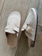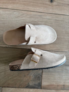 Cette paire de mules en suédine offre un confort optimal et un style décontracté. Avec leur design épuré et leur couleur beige neutre, elles s'adaptent facilement à toutes vos tenues. La boucle dorée ajoute une touche d'élégance, tandis que la semelle en liège assure un bon amorti pour un port agréable tout au long de la journée. Idéales pour une utilisation quotidienne, ces mules sont parfaites pour les journées d'été ou les moments de détente à la maison.