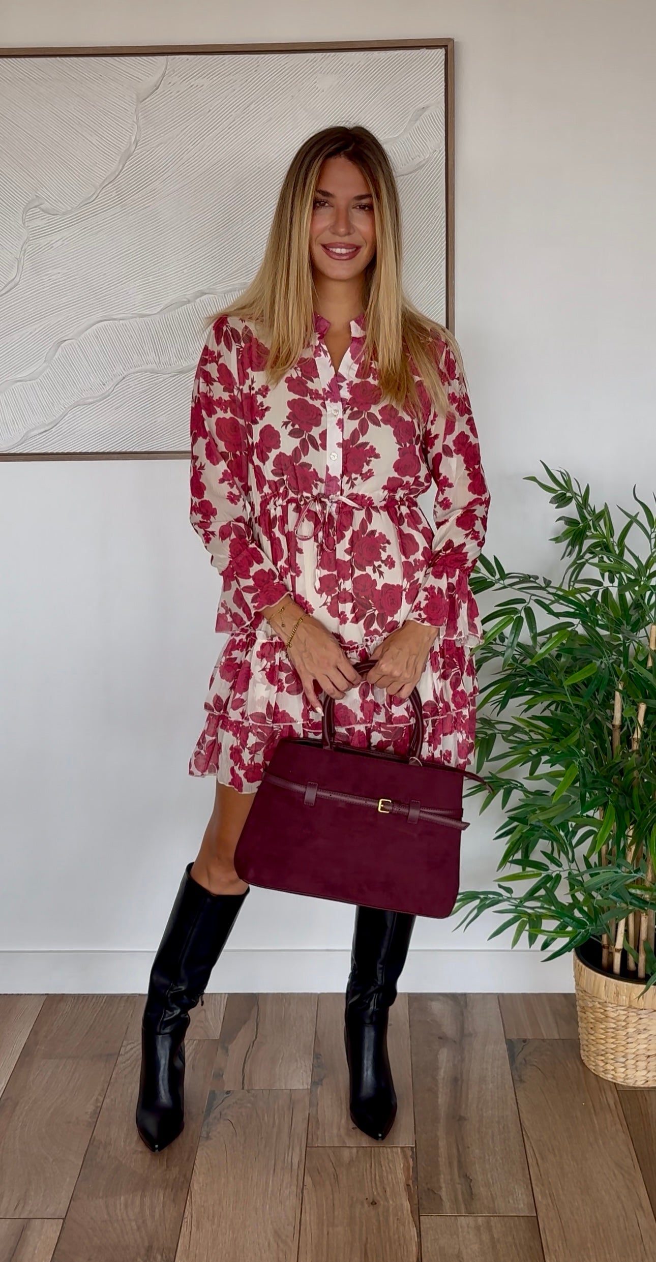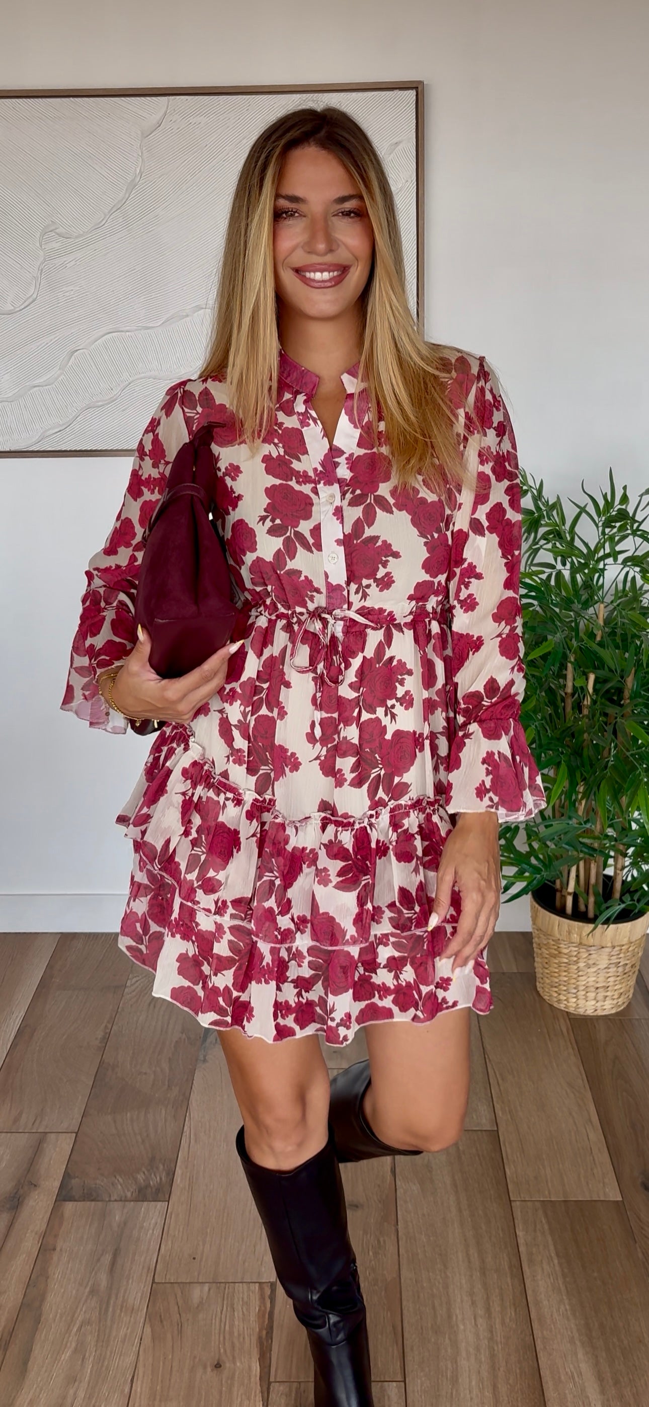 Cette robe Suzanne rose est parfaite pour créer un look romantique et féminin. Idéale pour vos rendez-vous galants, événements spéciaux ou sorties élégantes. L'imprimé floral bordeaux apporte une touche de sophistication et de douceur à votre garde-robe.